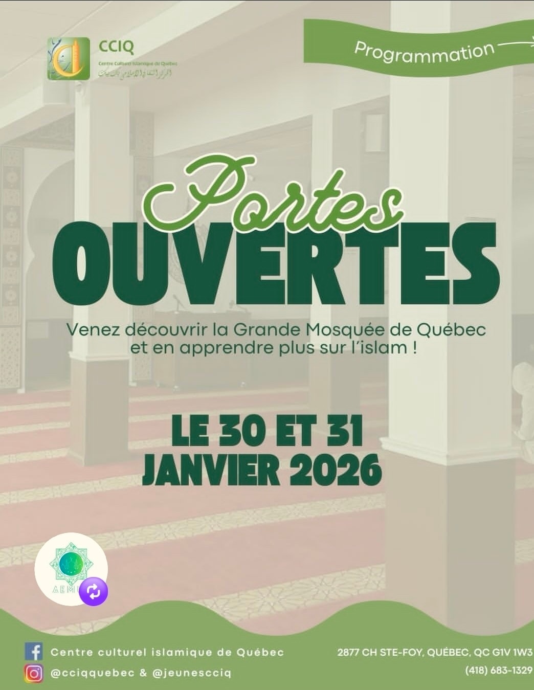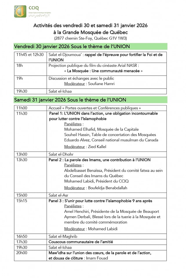 30 MORE | 9ème Commémoration de l’attentat de la Grande Mosquée de Québec et Journées Porte-Overte – Centre Culturel Islamique de Québec (CCIQ) – 2877 chemin Sainte-Foy – Québec, QC